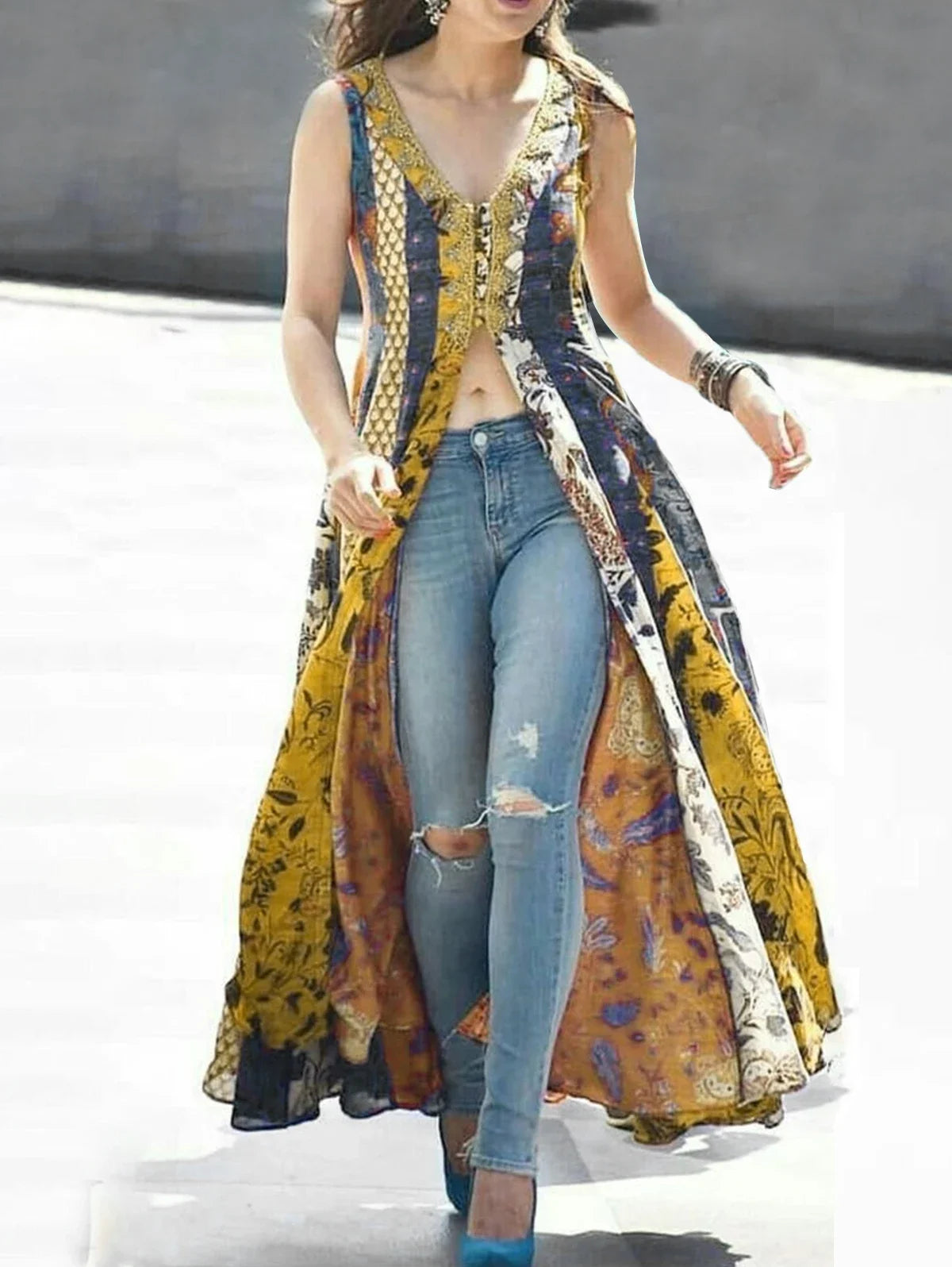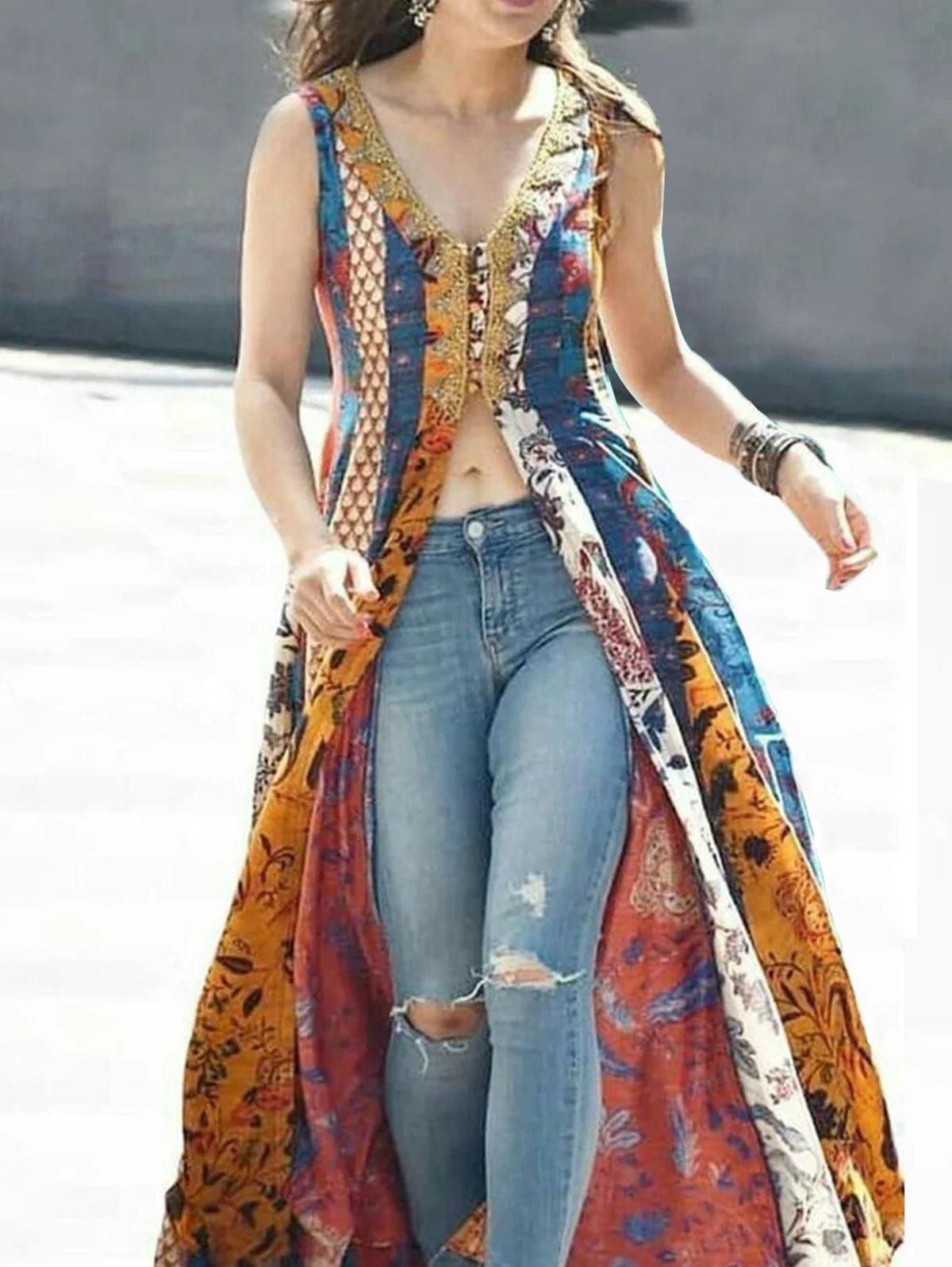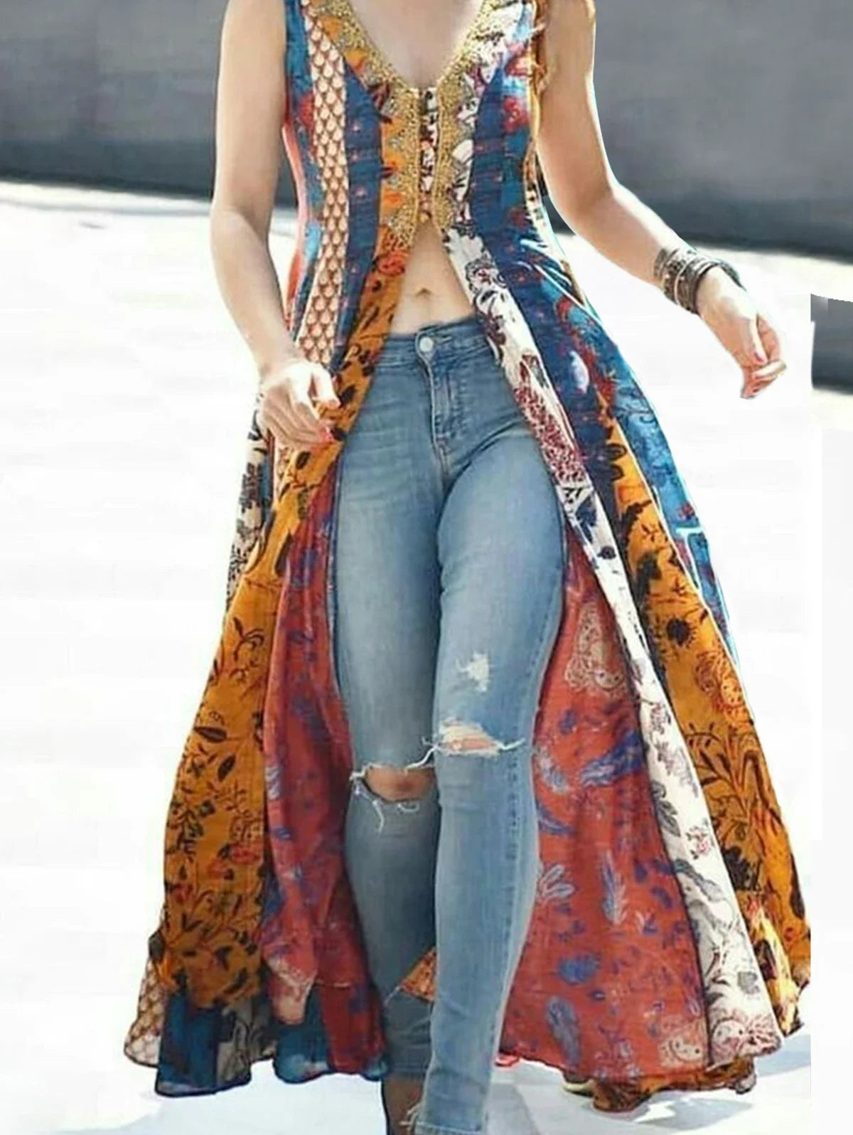 Sexy Deep V Neck Dress Women Ethnic Floral High Split Maxi Tank Dress Sleeveless Summer Party Dresses Vestidos Para Mujer 2025