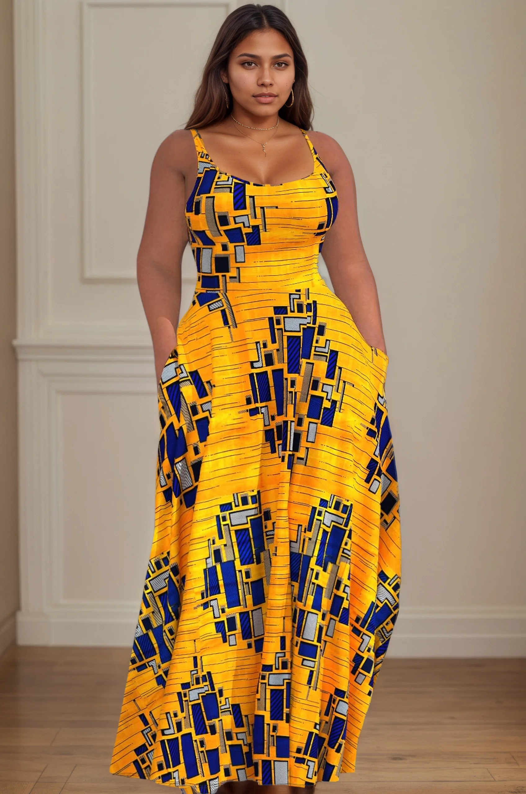 Women Summer Dresses Beach Geometric Print Tank Dress U Neck Sleeveless Sundress Pocket Maxi Dress Plus Size Women Clothing