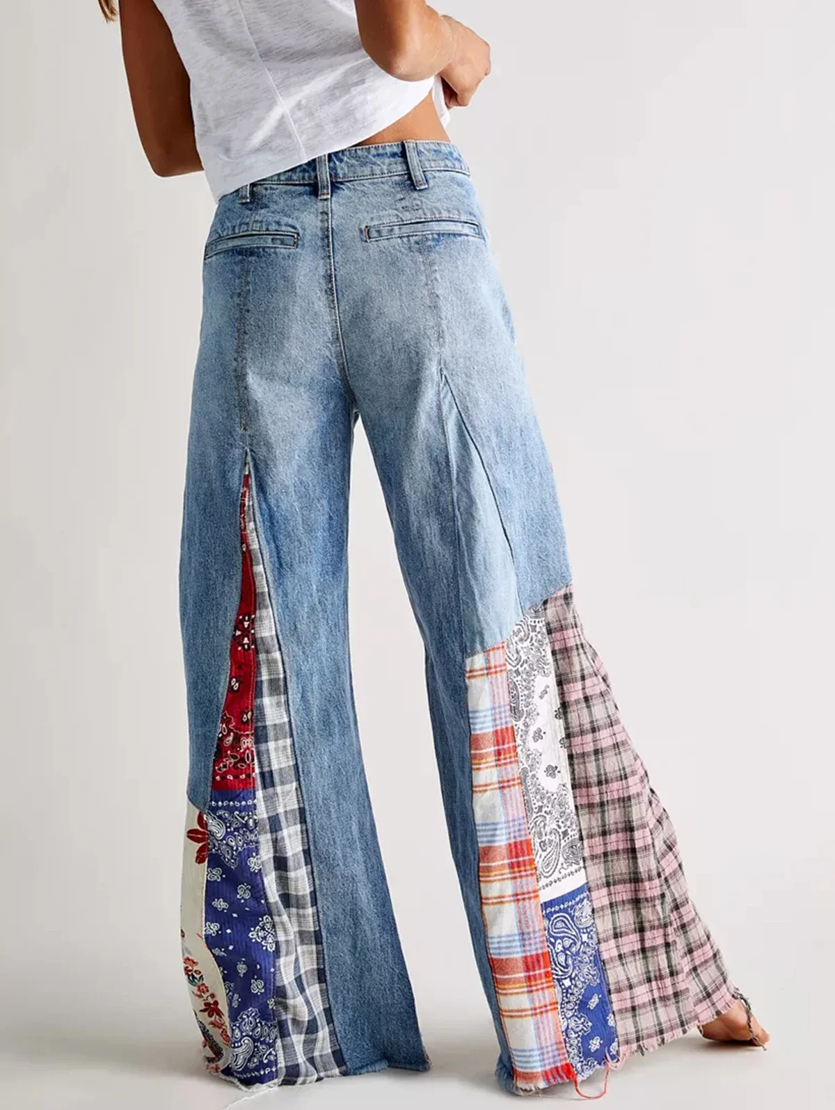 Women's Patchwork Denim Big Flare Pants Vintage Zipper Streetwear Pocket Wide Leg Mid-Waist Jeans Pants Spring Autumn 2024